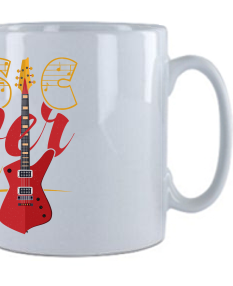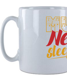 Deze witte mok heeft een inspirerende opdruk met de tekst "Music Never Sleeps" in opvallende kleuren geel en rood. Het woord "Music" is versierd met muzikale noten, en naast de tekst staat een afbeelding van een rode elektrische gitaar. Deze mok is perfect voor muziekliefhebbers en is ideaal om je favoriete drankje in te serveren, terwijl je geniet van je passie voor muziek.