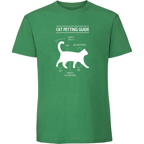Dit zwarte t-shirt toont een humoristische gids voor het aaien van katten. Het diagram geeft aan waar je een kat wel en niet kunt aaien, variërend van "JA" en "AANVAARDBAAR" op de rug, tot "NIET PROBEREN" op de staart, en "NEE" op de buik met de waarschuwing "DE DOOD IS ZEKER". Perfect voor kattenliefhebbers met gevoel voor humor!
