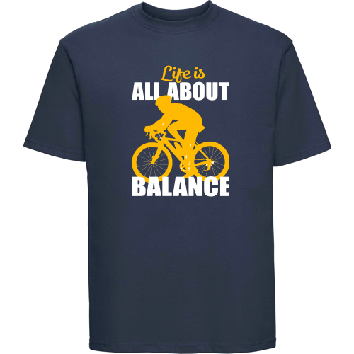 Dit zwarte t-shirt toont een opvallende gele afbeelding van een fietser met de inspirerende tekst "Life is All About Balance". De combinatie van de dynamische fietser en de krachtige boodschap maakt dit t-shirt perfect voor iedereen die gelooft in de waarde van evenwicht in het leven. Ideaal voor fietsliefhebbers en mensen die graag een positieve levensstijl uitdragen.